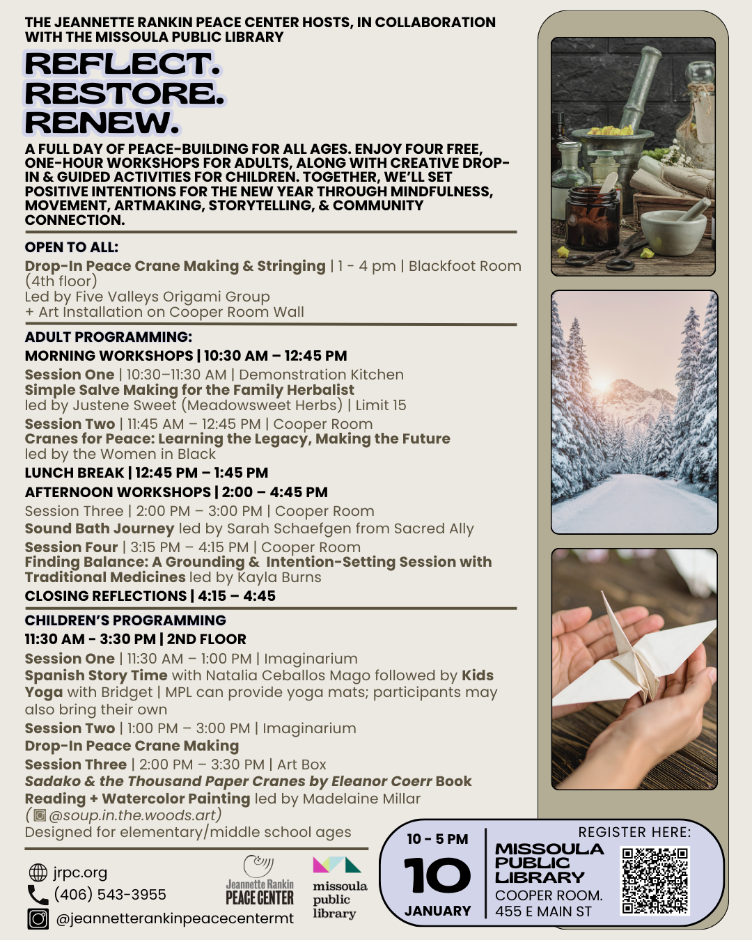 VISION: The Jeannette Rankin Peace Center envisions a Western Montana where compassionate communication and conflict resolution create the foundation for social justice and environmental sustainability. We serve as a vital resource center where diverse communities come together to learn, share, and work toward positive change.
