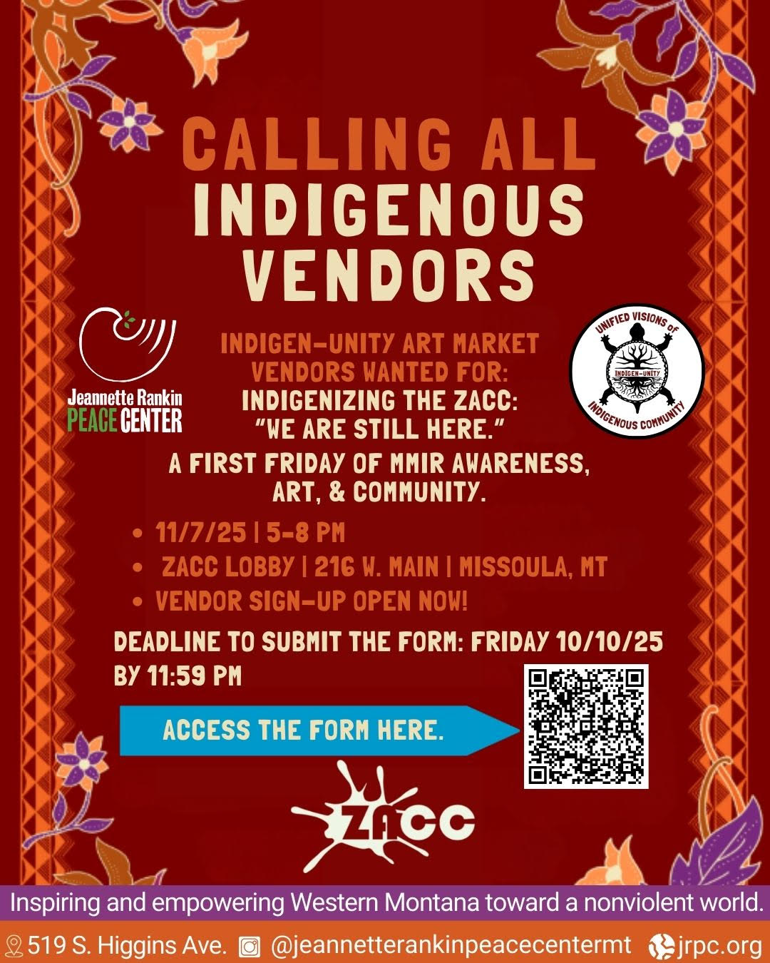 We’re seeking Indigenous artists to table at Indigenizing the ZACC (@zootownarts): We Are Still Here — a First Friday evening of MMIR awareness, art, and community.
