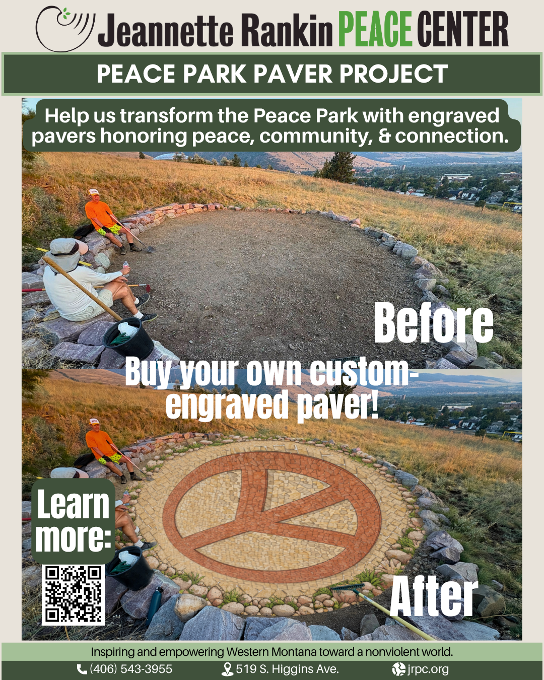 In 2007, we became aware of 4.5 acres of land for sale on the south face of the North Hills. We immediately thought it would be a great place for another visible sign of peace, as many people missed the old Missoula Peace Sign that came down in 2001. The idea garnered much support from our members who donated the money to help us purchase the land. In time for the International Day of Peace that year, a peace sign made of white sheets and towels held down by painted rocks graced the hillside, and our Peace Park became a reality.
